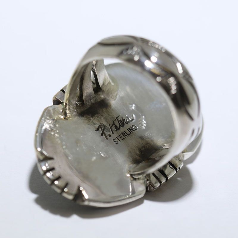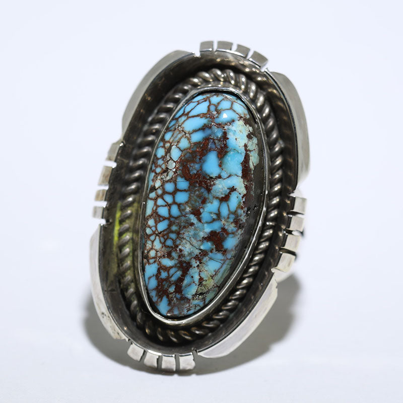 Sterling silver ring is set with Stabilized Kingman Turquoise and features a silver border around the stone.