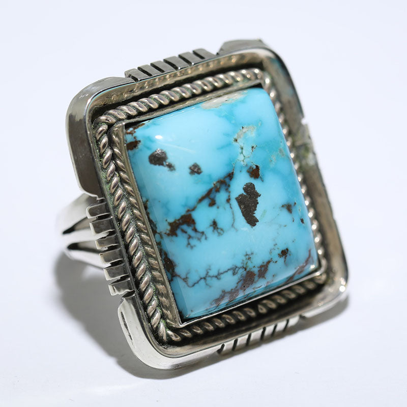 Sterling silver ring is set with Natural Morenci Turquoise and features a silver border around the stone.