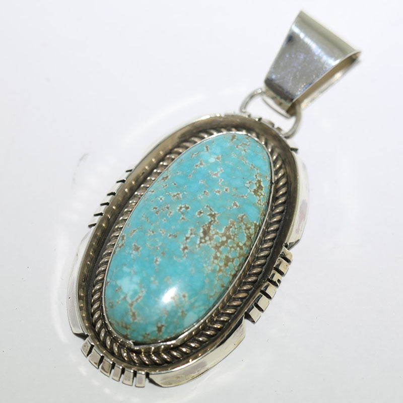 Sterling silver pendant is set with Number Eight Turquoise and features a silver border around the stone.