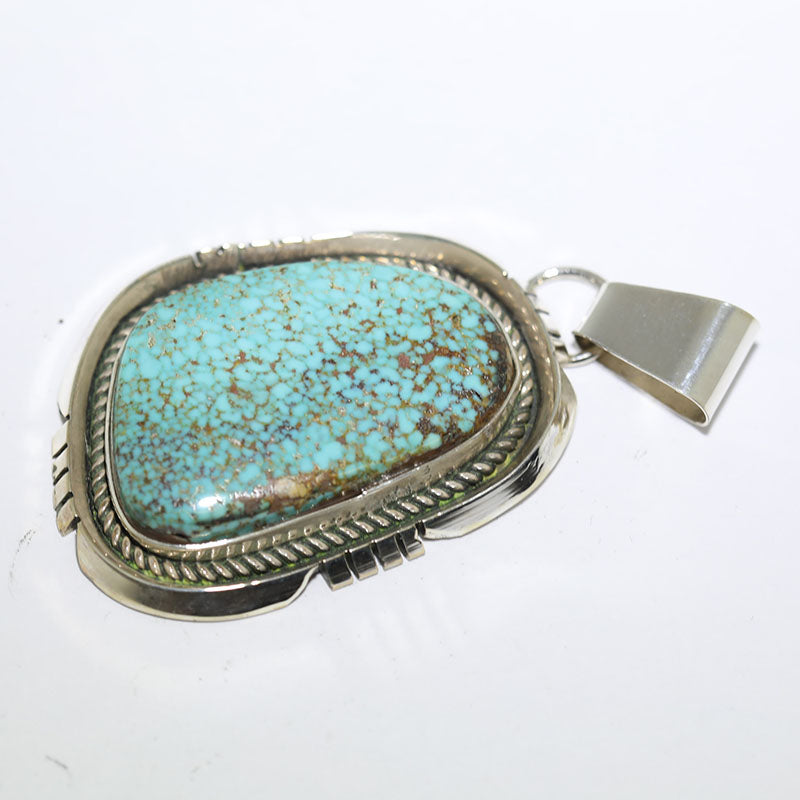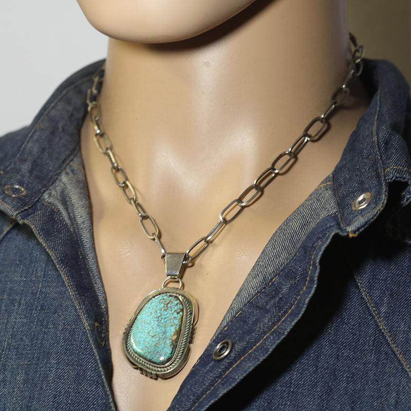 Sterling silver pendant is set with Turquoise Mountain Turquoise and features a silver border around the stone.