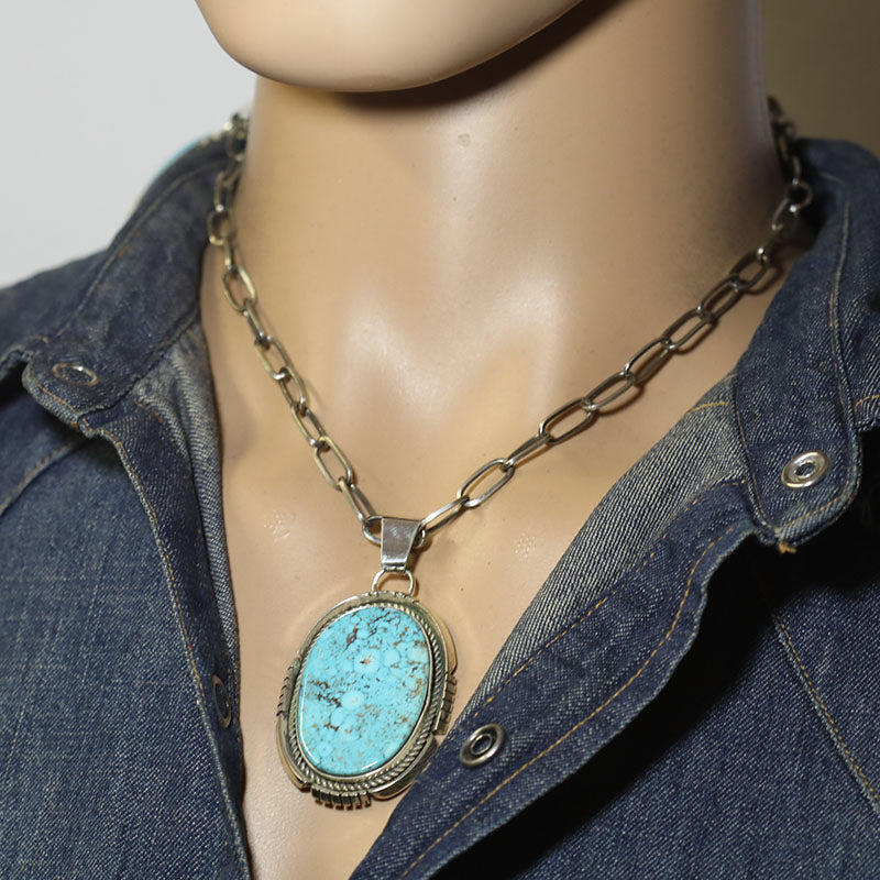 Sterling silver pendant is set with Turquoise Mountain Turquoise and features a silver border around the stone.