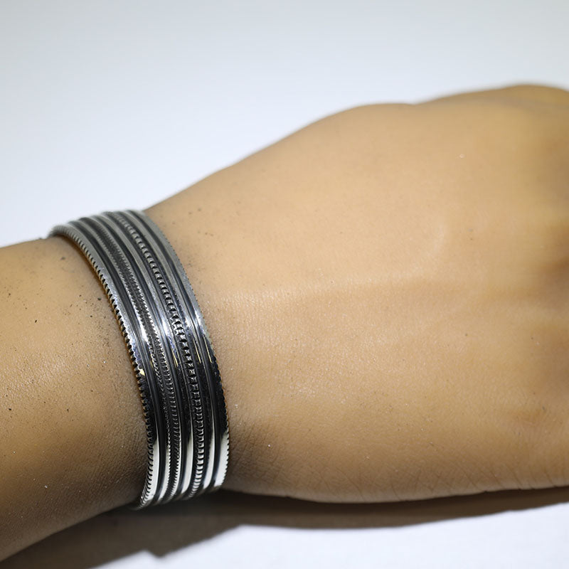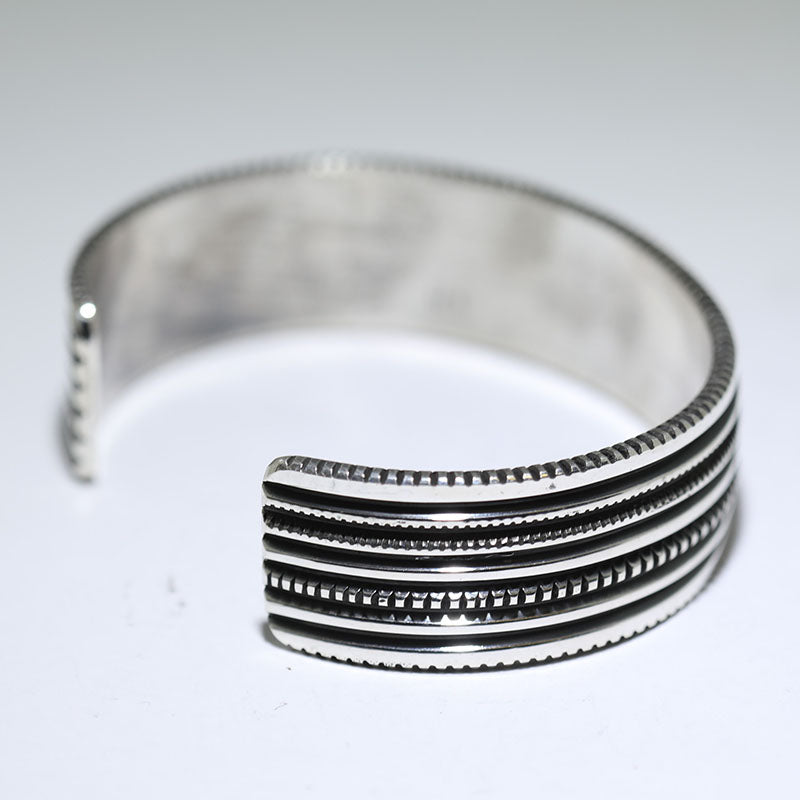 Harrison was born in 1952 and is half Navajo and half Irish. He learned silversmithing from his grandfather. He also took silversmithing classes by Jesse Monongya and Tommy Jackson. His life is very traditional; therefore, his jewelry is very traditional. He is known for his simple and clean designs.