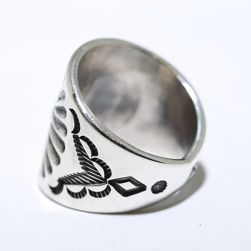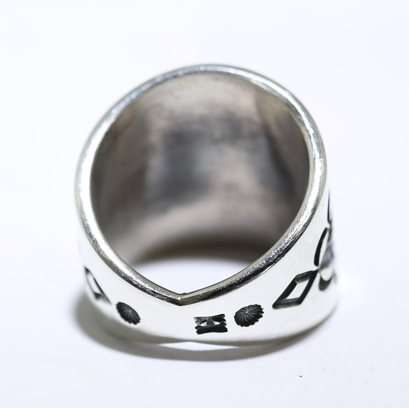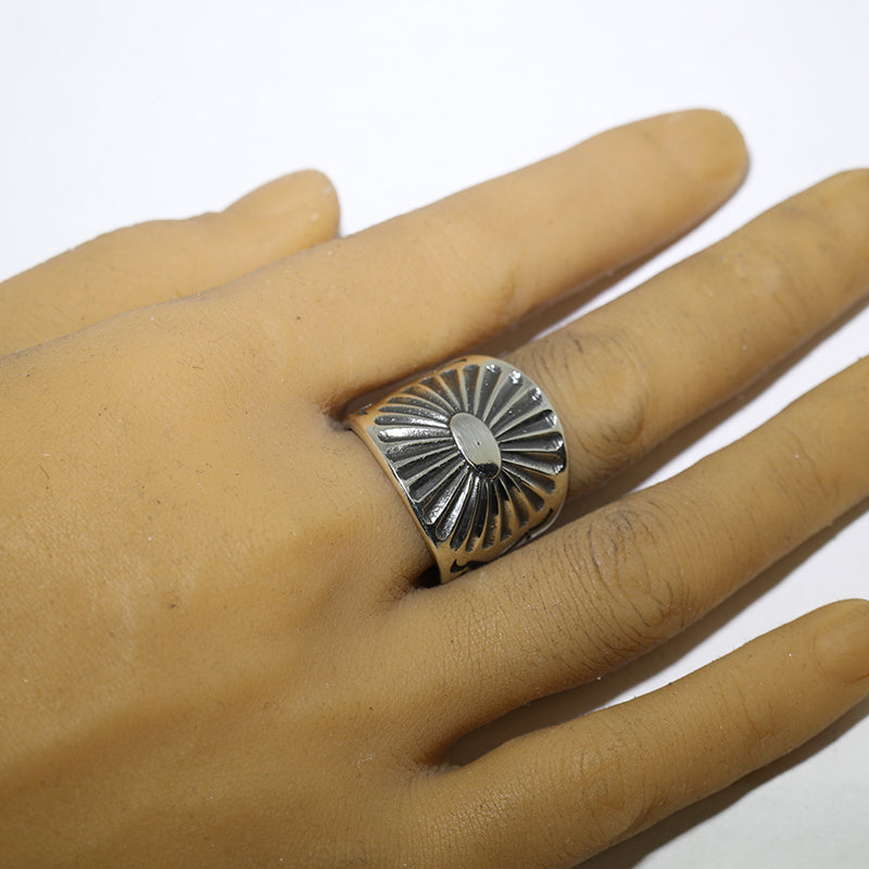 Sterling silver ring features an oval in the center surrounded by silver rays with hand stamped designs along the band.
