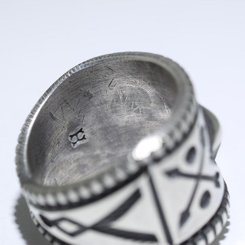 Sterling silver ring features a diamond bump out in the center with hand stamped crossed arrows on each side.