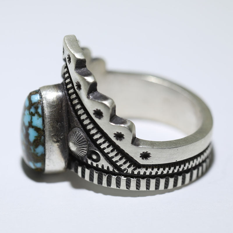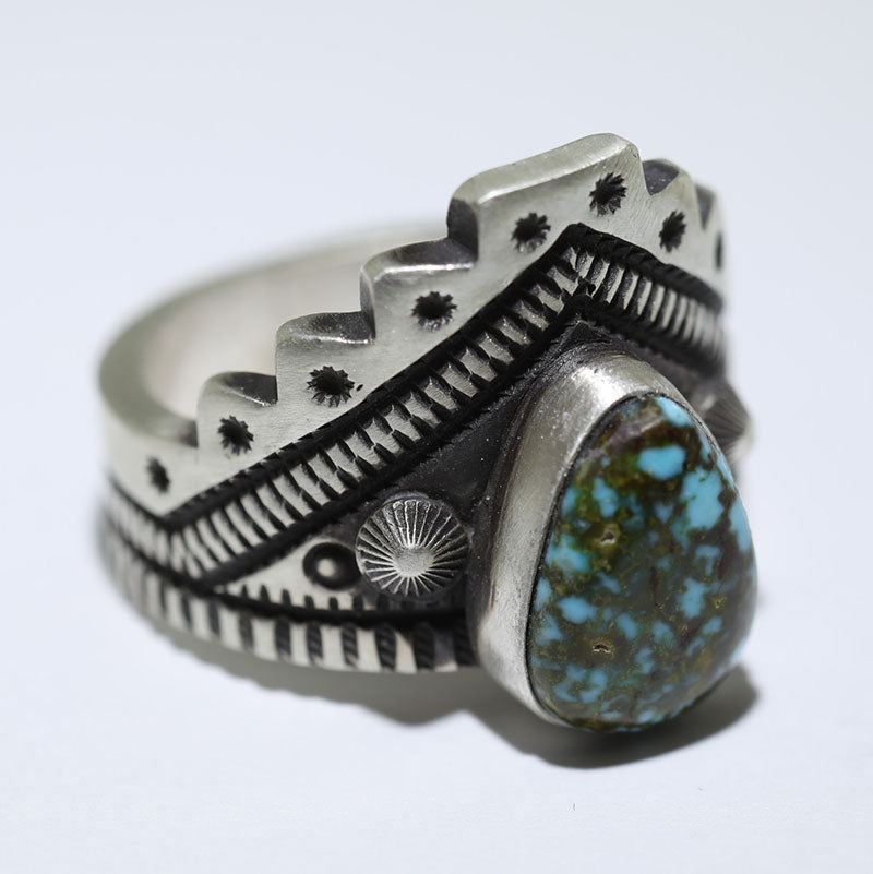 Sterling silver ring features a pyramid design with detailed hand stamped designs and is set with Stabilized Kingman Turquoise.