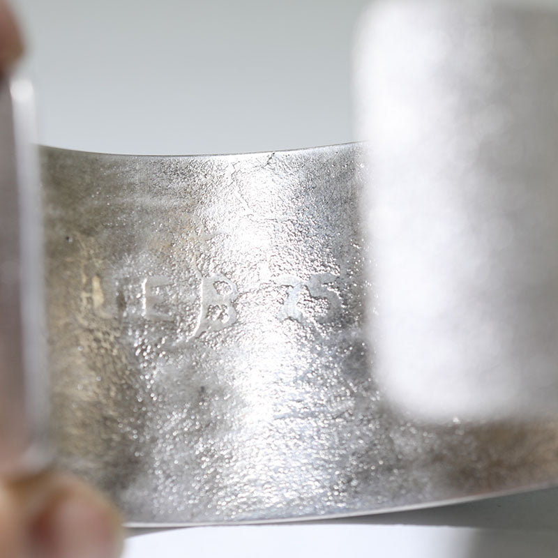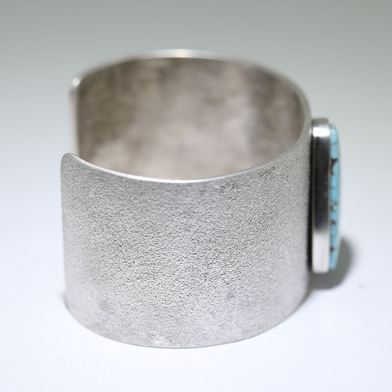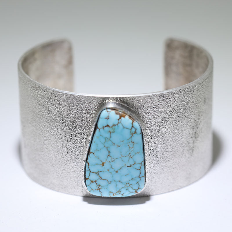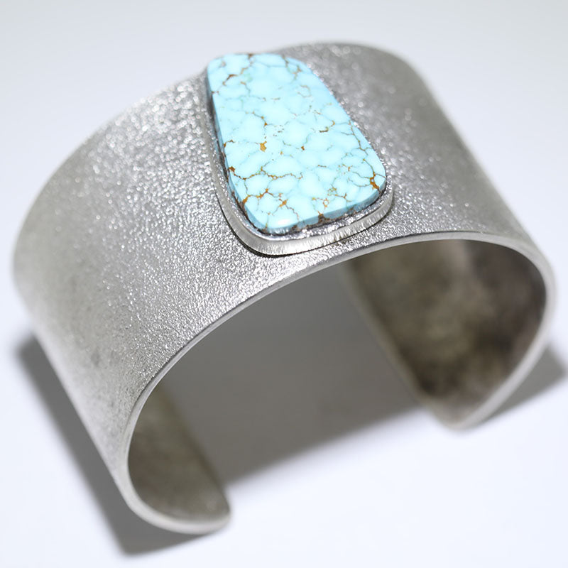 Sterling silver bracelet is created using the tufa cast method and is set with a large Number Eight Turquoise stone in the center.