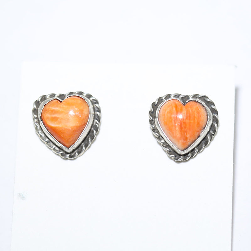 Sterling silver, heart shaped earrings are set with orange Spiny Oyster Shell.