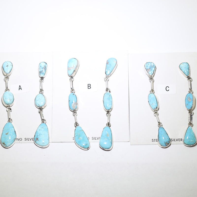 Sterling silver, post earrings are set with Natural Kingman Turquoise stones which dangle from each other.