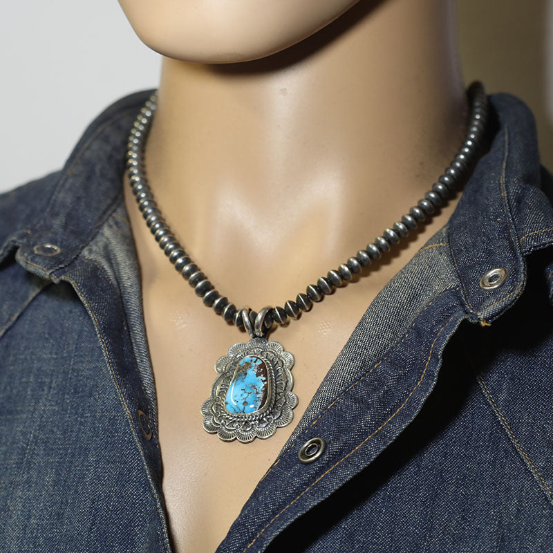Sterling silver pendant is set with Candelaria Turquoise which has a silver, hand stamped border.
