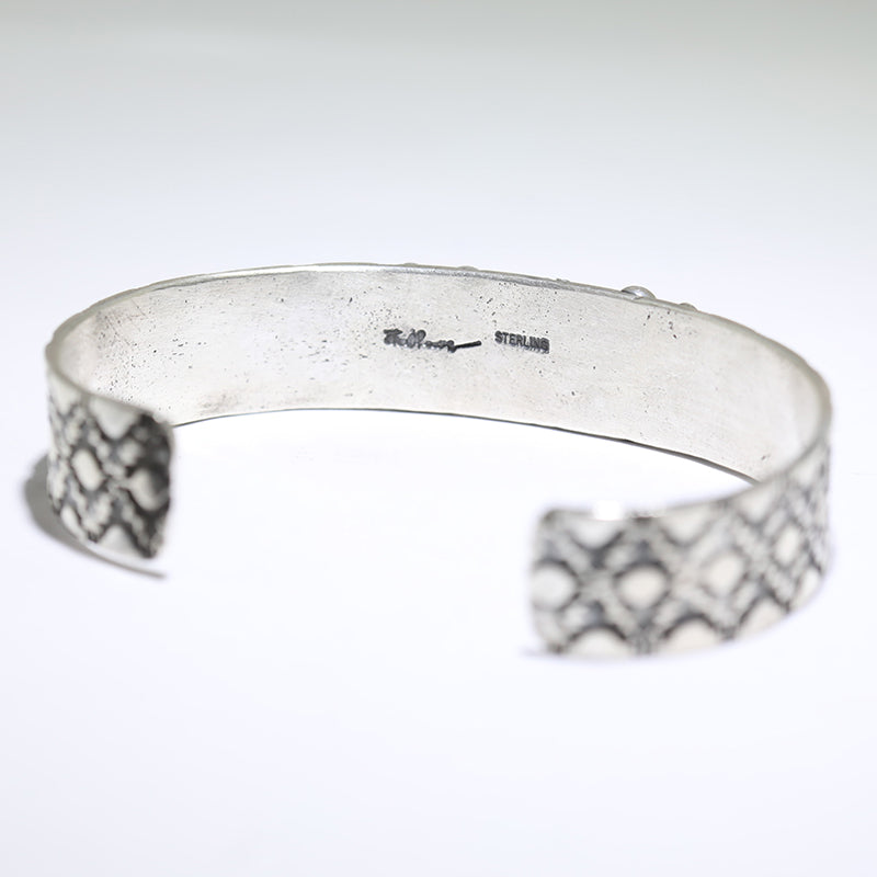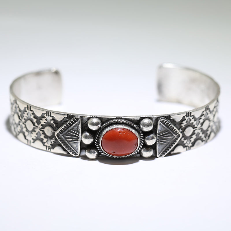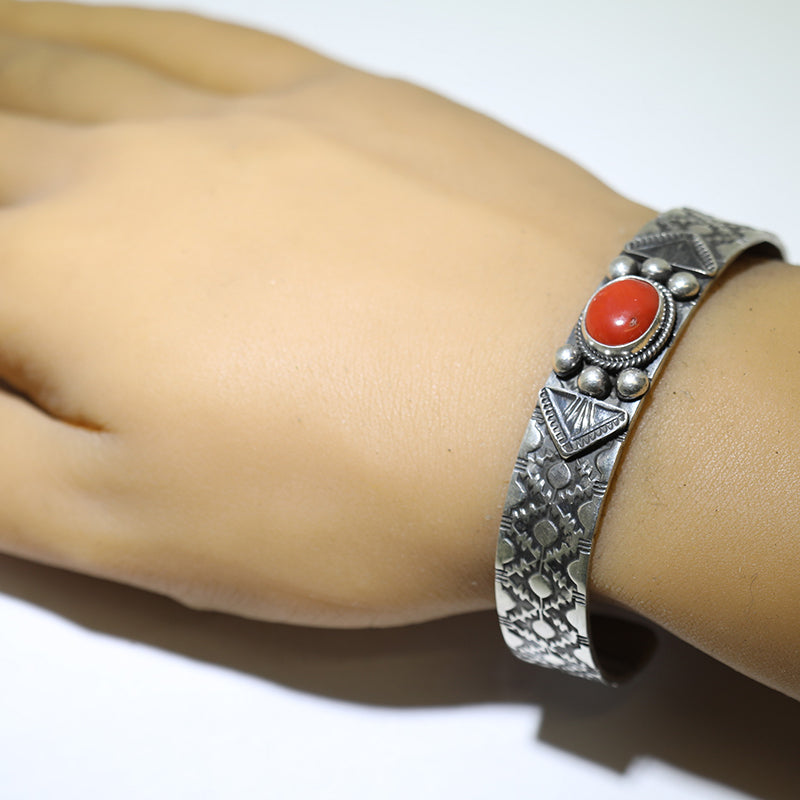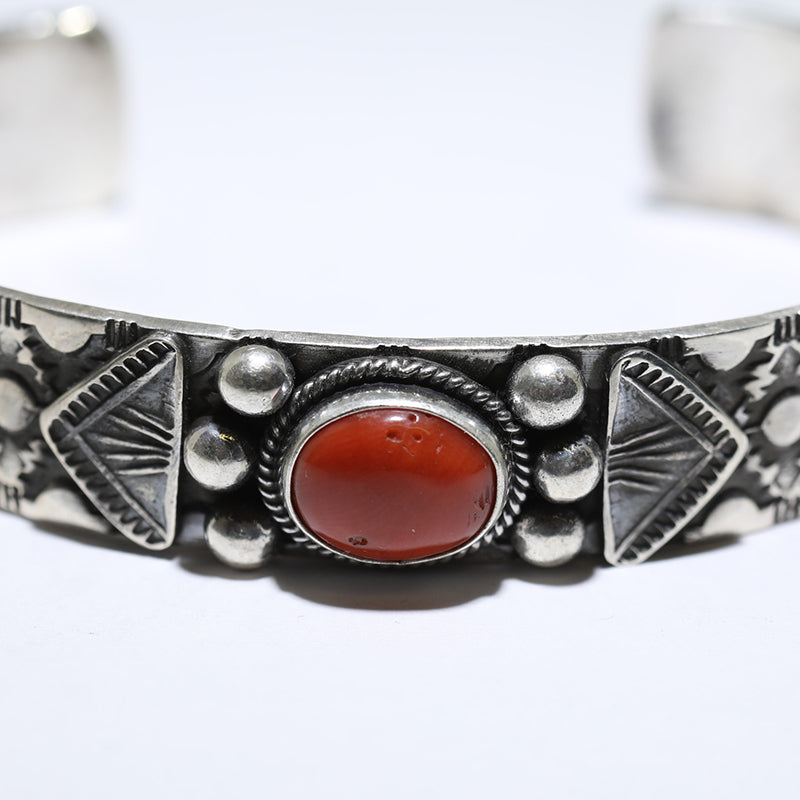 Sterling silver bracelet is set with Coral stone and features hand stamped designs on each side of the stone.