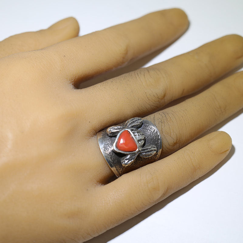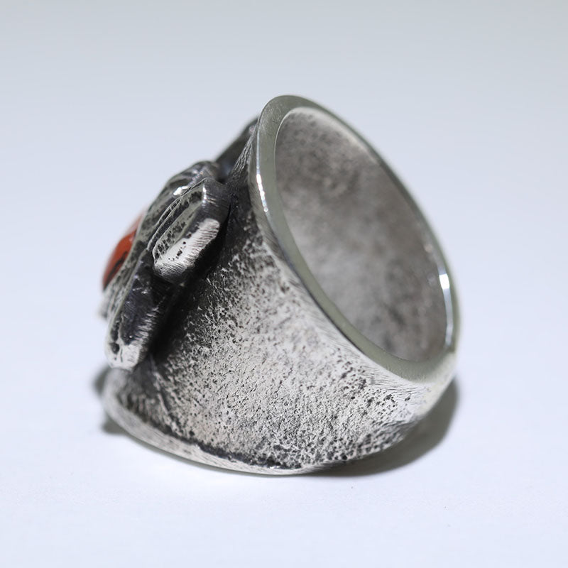 Sterling silver ring features a Native American head in the center with a traditional hair bun on each side. The face is set with Coral stone.