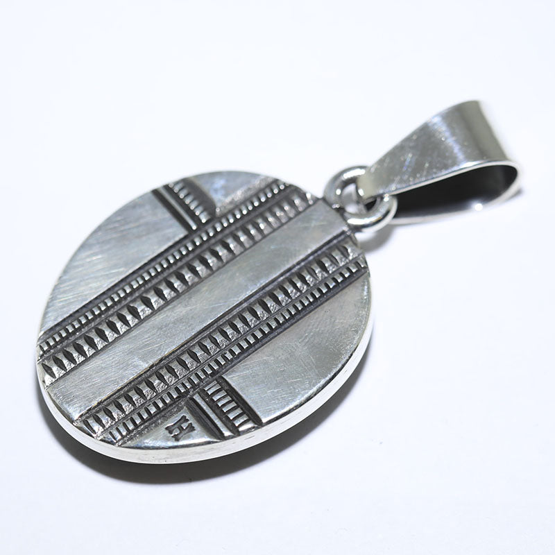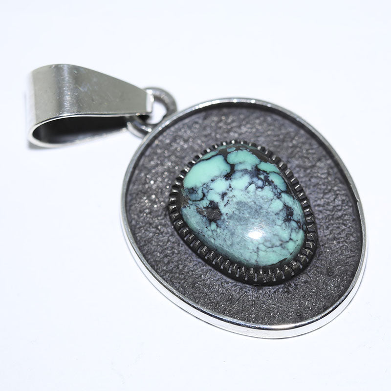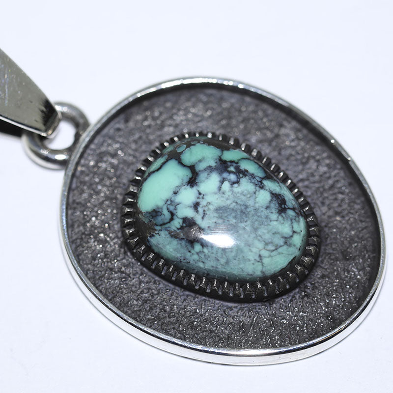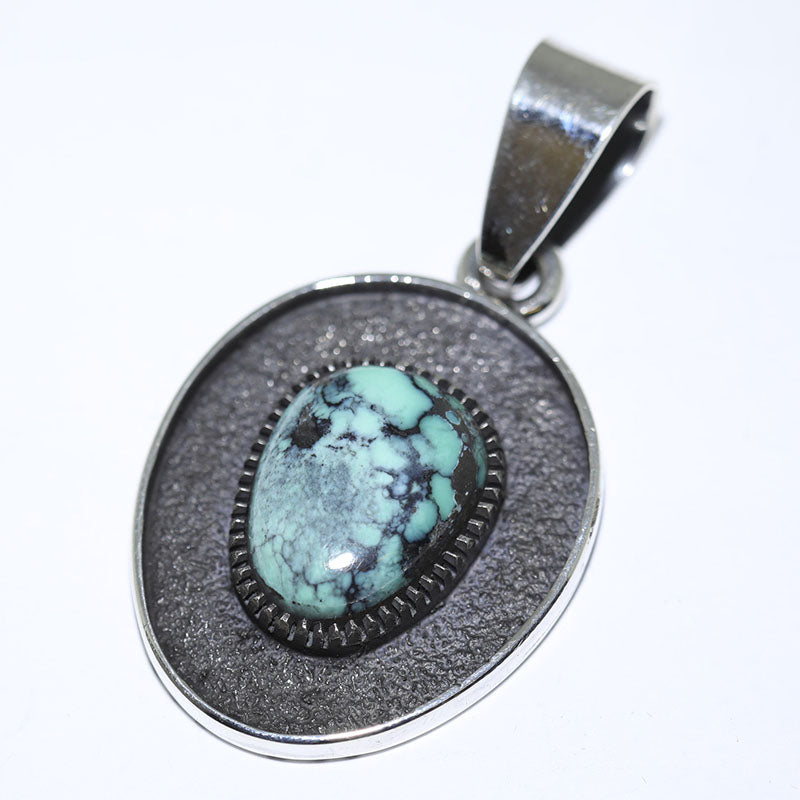 Sterling silver pendant is set with Natural Damale Turquoise in the center with a silver, oxidized border surrounding the stone.