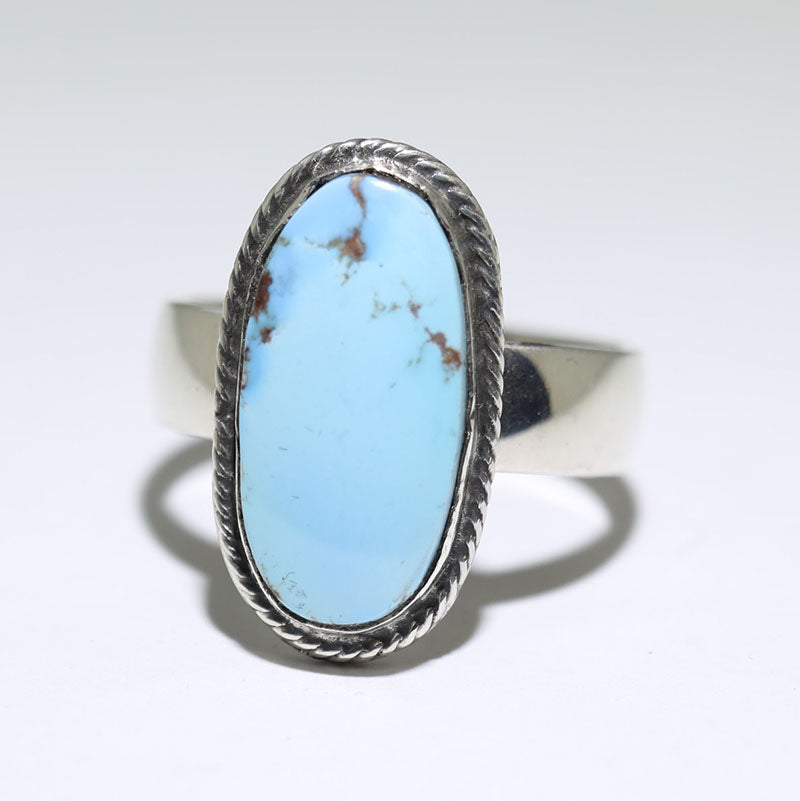 Sterling silver ring is set with Golden Hill Turquoise and surrounded by twist wire.