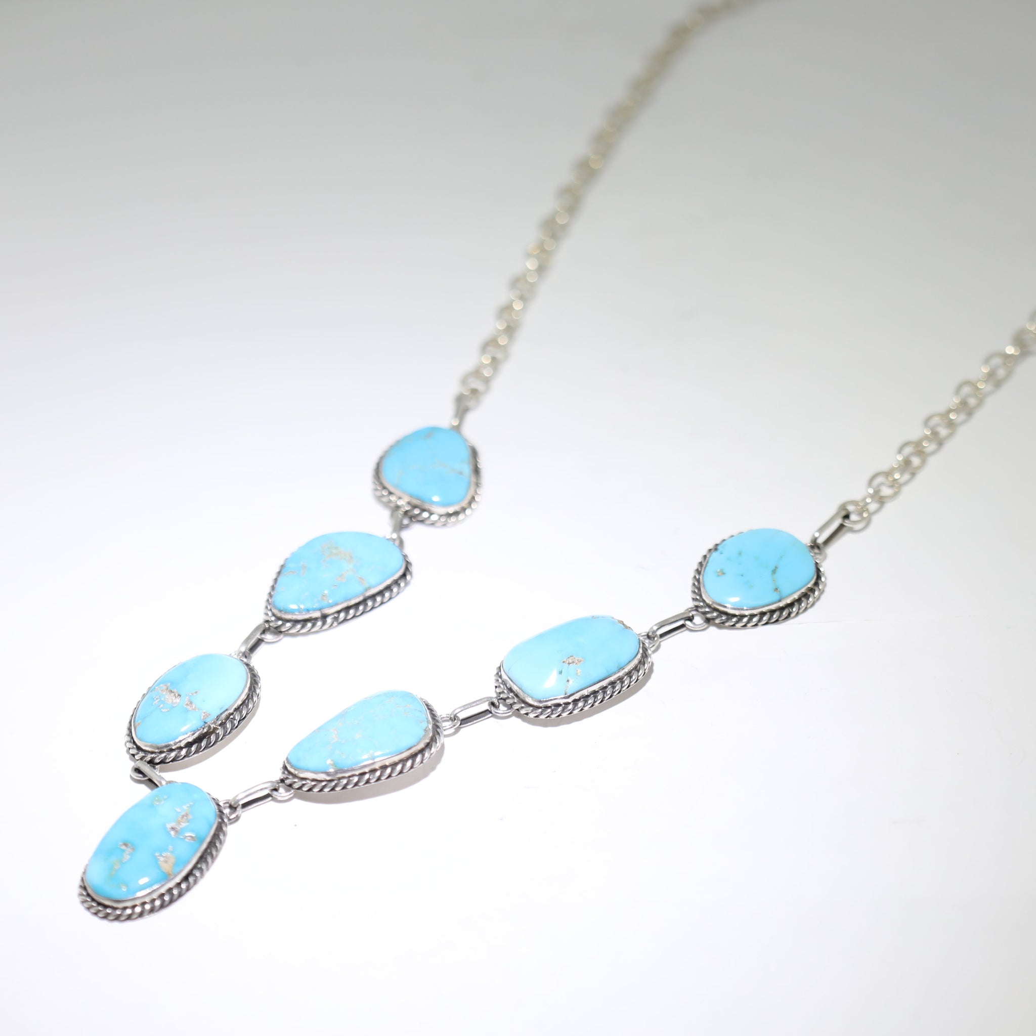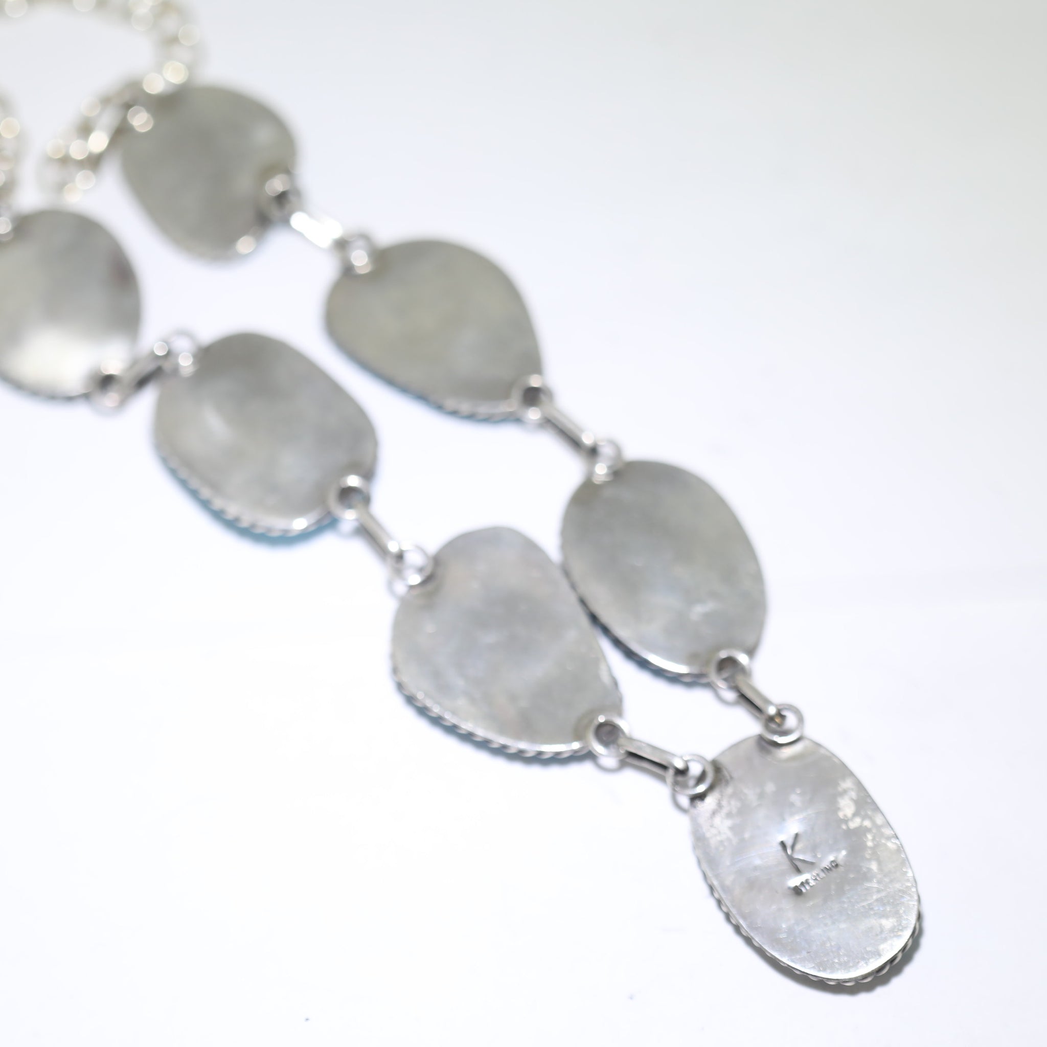 Beautiful, handmade sterling silver Necklace is set with KingmanTurquoise stones. The artist put a had stamp around the stone.