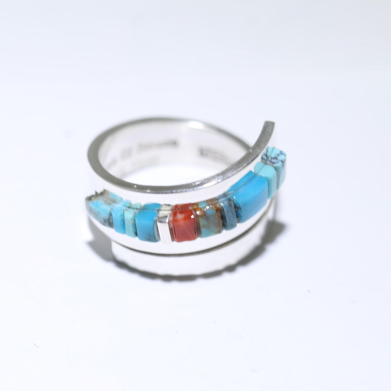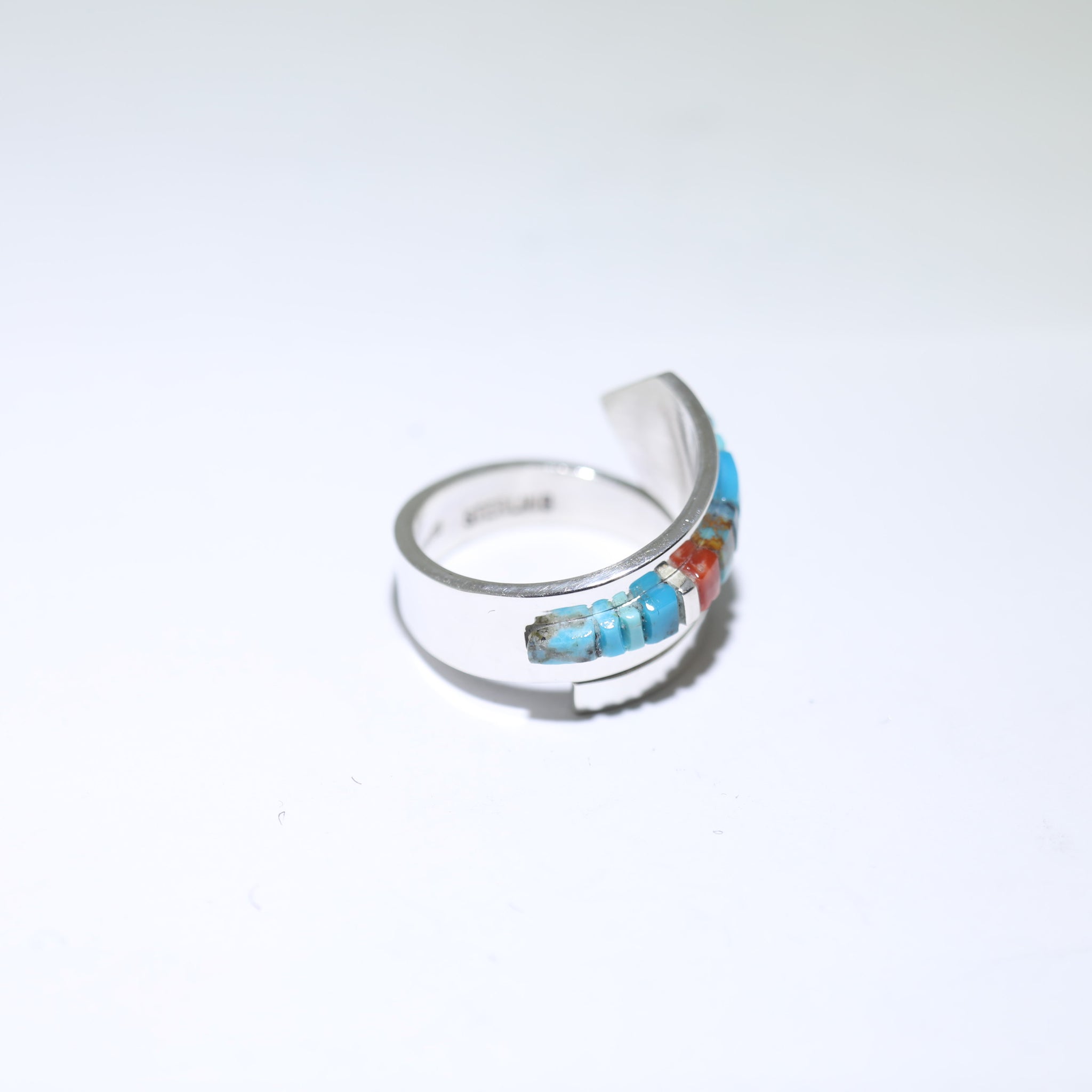 Beautiful sterling silver ring, inlaid with Blue Turquoise and Red coral this ring is an adjustable one size up or down