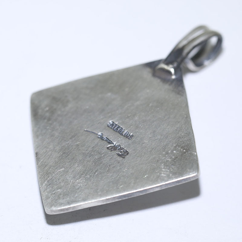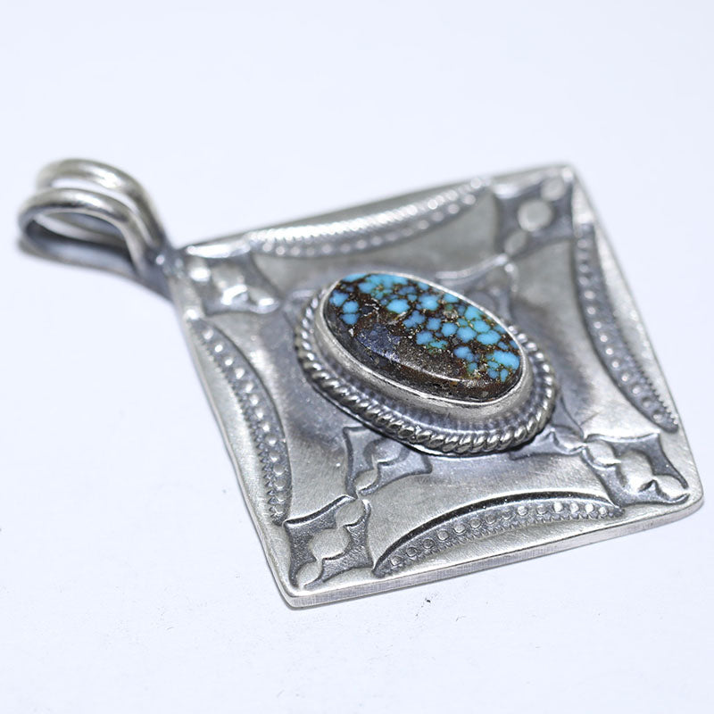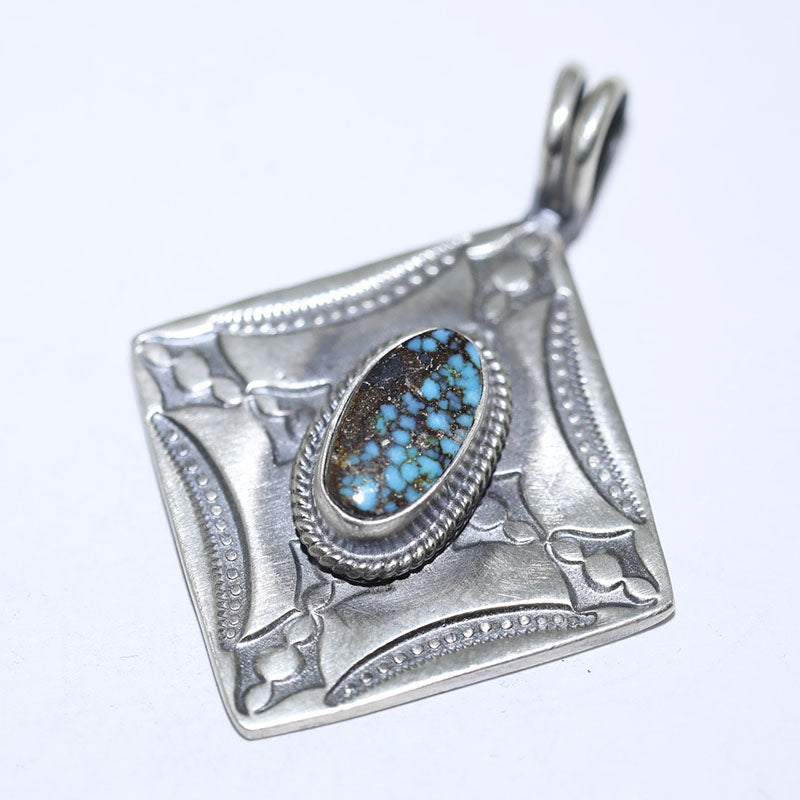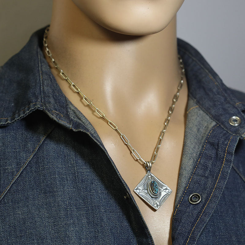 Sterling silver pendant features a diamond shape with hand stamped designs and is set with Stabilized Kingman Turquoise.