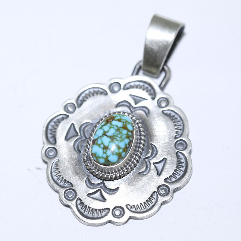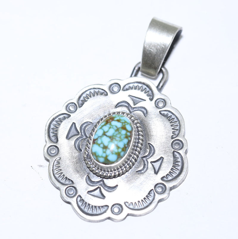 Sterling silver pendant features a concho shape with hand stamped designs and is set with Stabilized Kingman Turquoise.