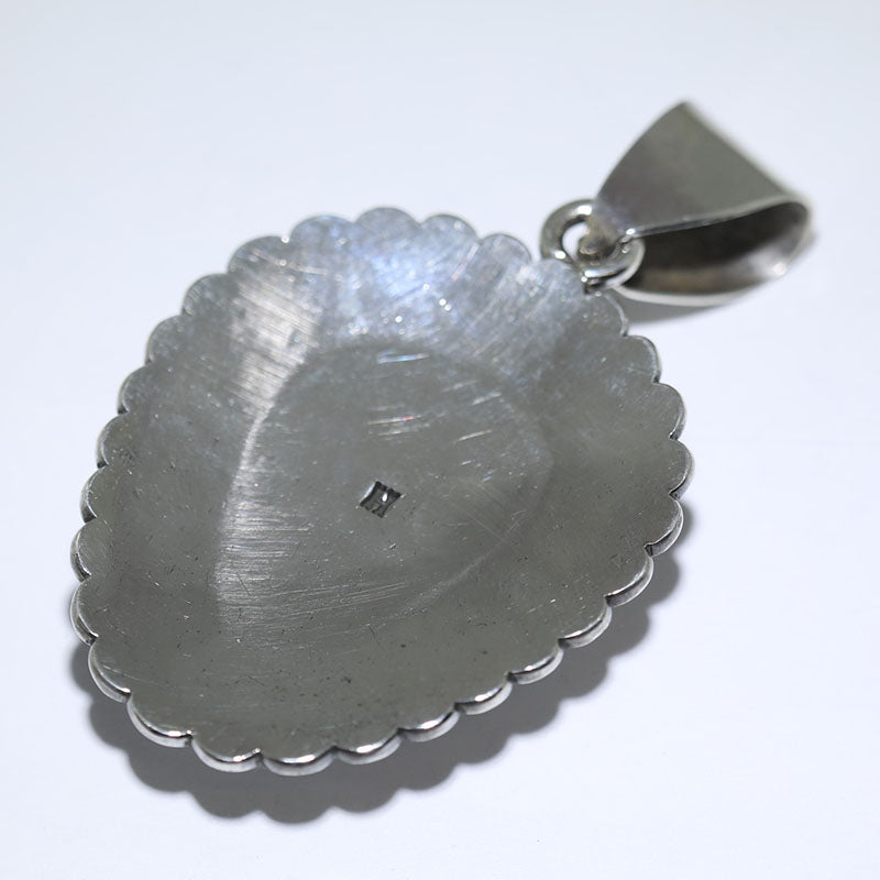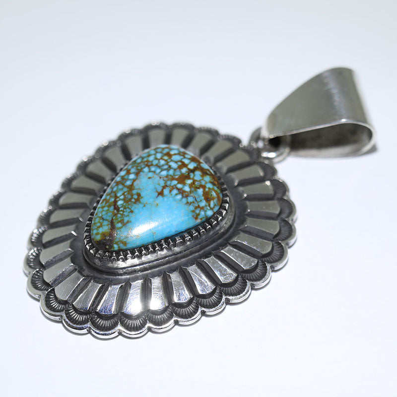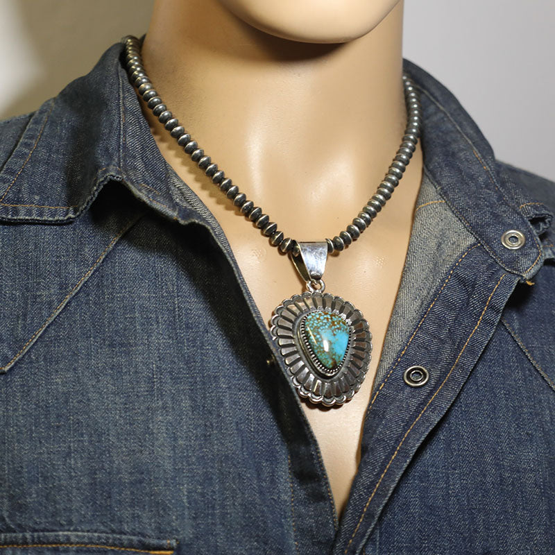 Sterling silver pendant has a concho type design and is set with Stabilized Kingman Turquoise. A beautiful silver, hand stamped border surrounds the large stone.