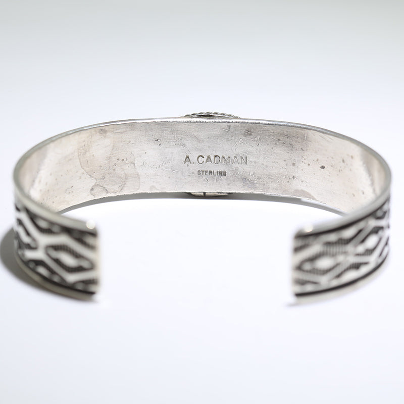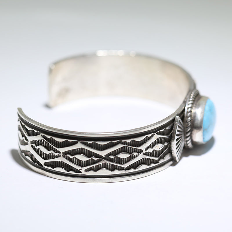 Sterling silver bracelet features hand stamped diamond designs along the band and is set with Natural Kingman Turquoise in the center.