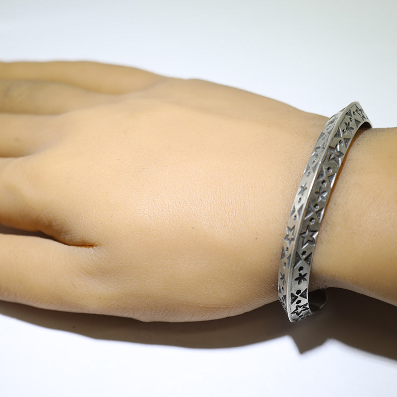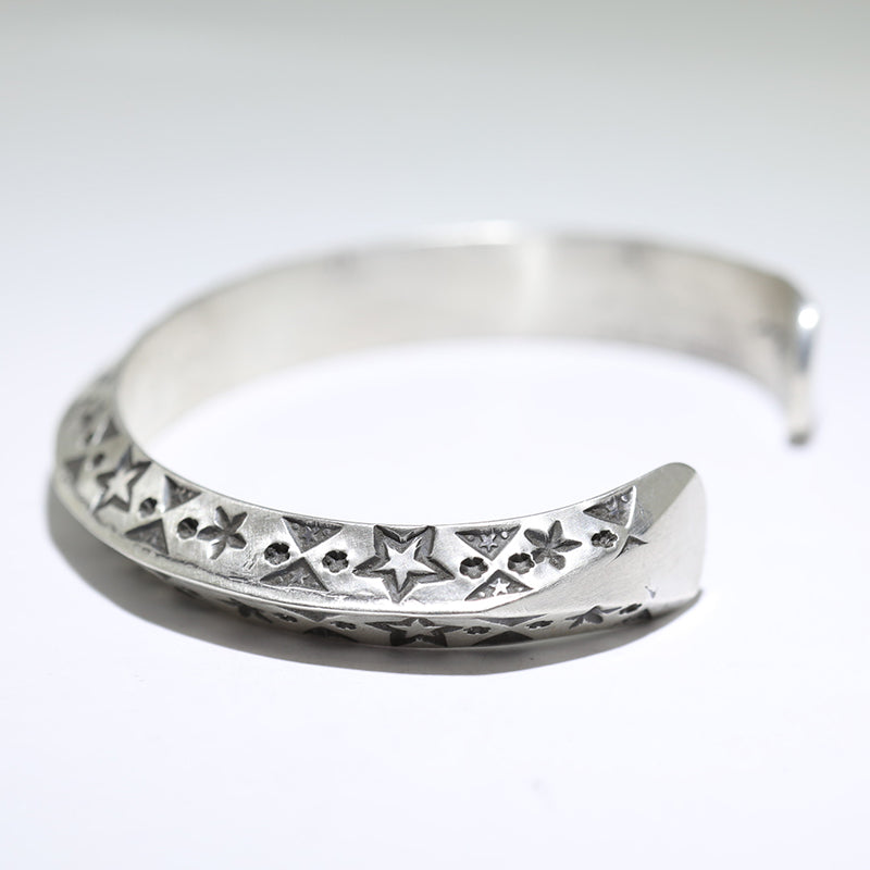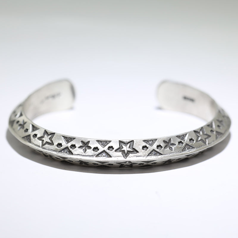 Sterling silver bracelet features hand stamped designs and stars all along triangle wire.