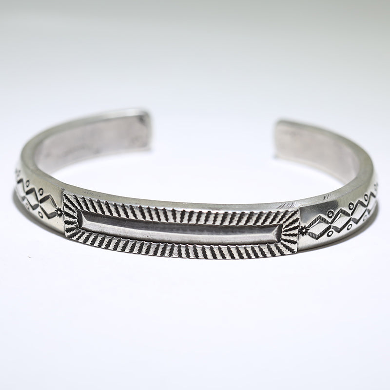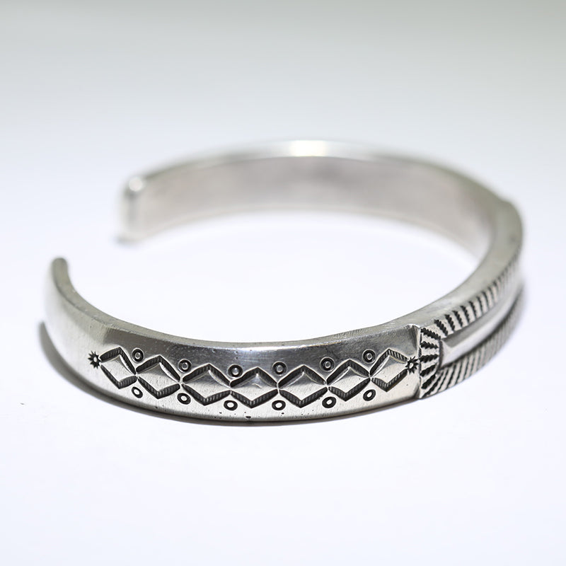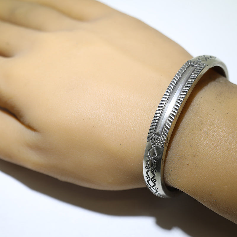This coin silver bracelet features hand stamped designs along the band with a shiny silver center with stamped edges.
