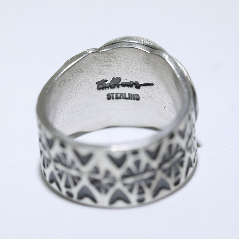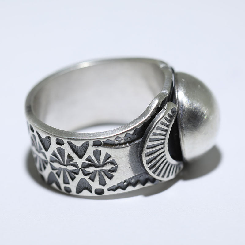 Sterling silver ring features a domed silver center with hand stamped designs along the band.