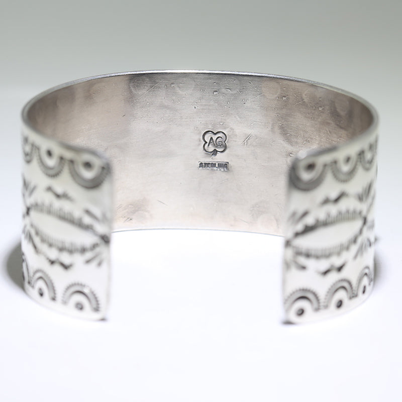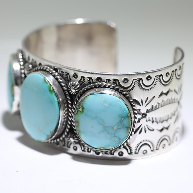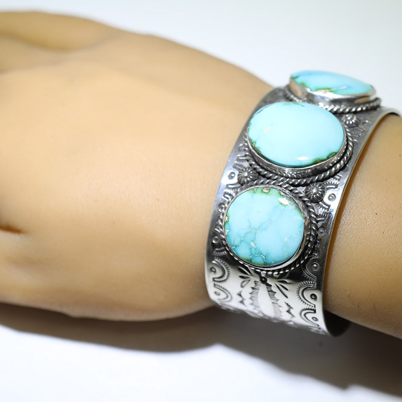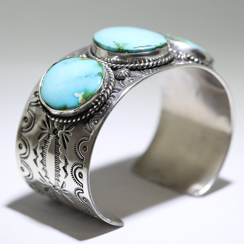 Large, sterling silver bracelet features hand stamped designs and set with three huge Natural Sonoran Gold Turquoise stones at the top.