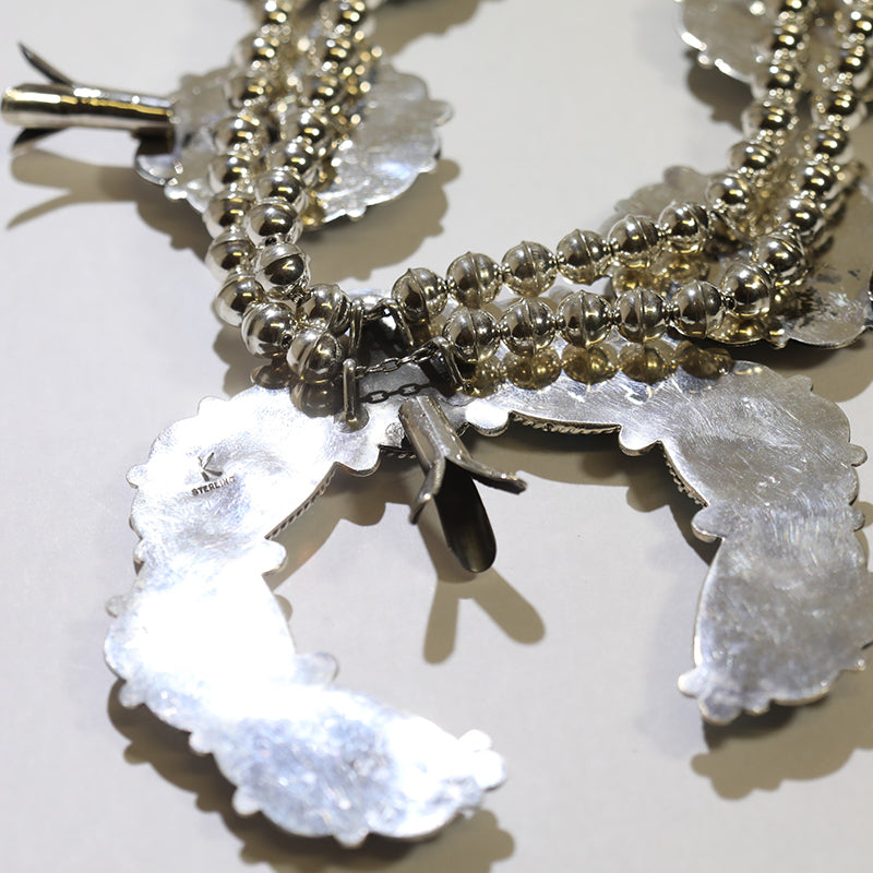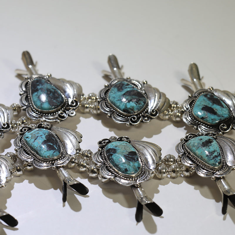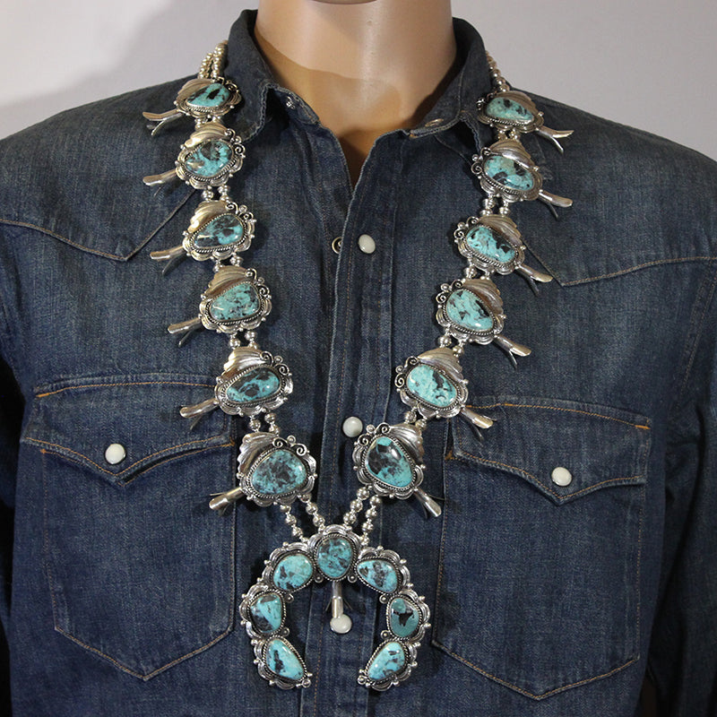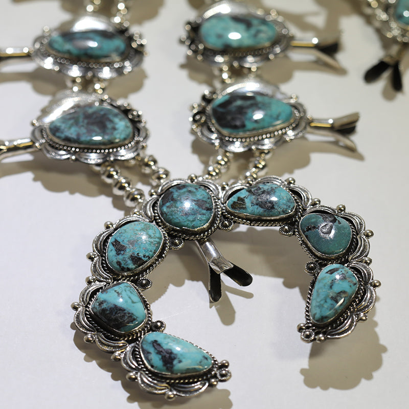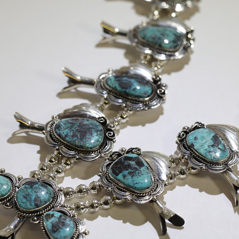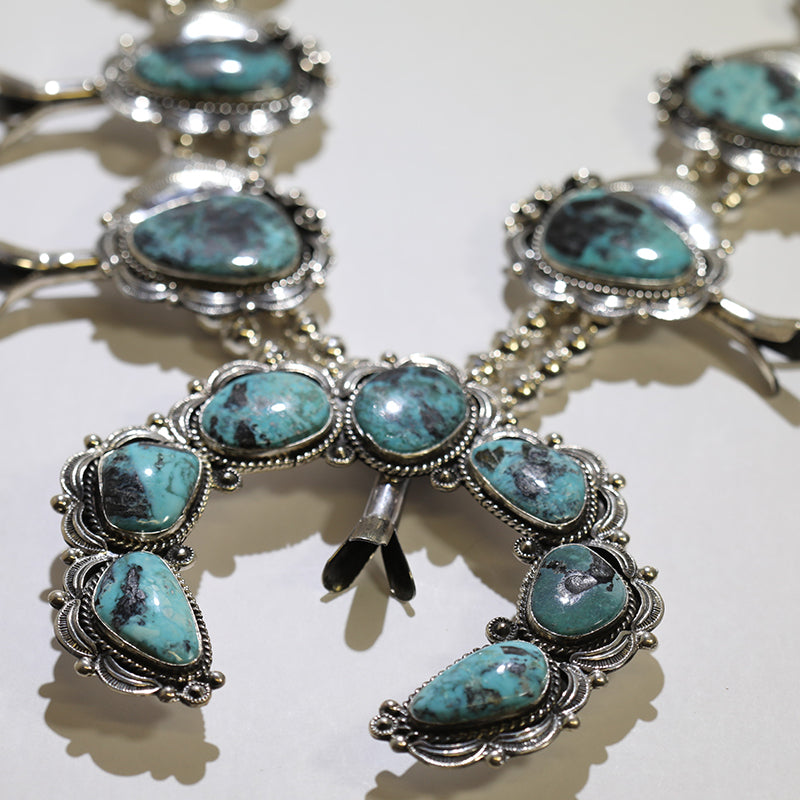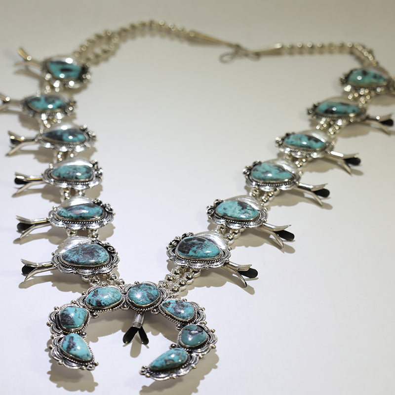 Beautiful, handmade sterling silver Squash Blossom Necklace is set with Natural Stomy Mountain Turquoise stones which features hand stamped edges.