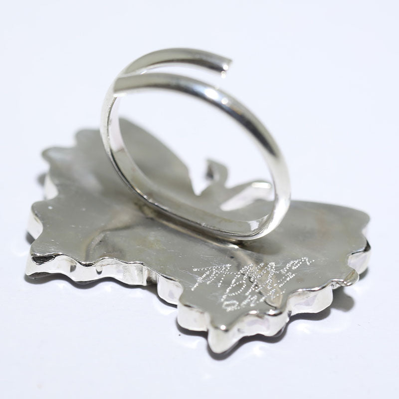 Beautiful sterling silver ring is shaped like a Butterfly and is inlaid with Malachite and White Mother of Pearl stones.