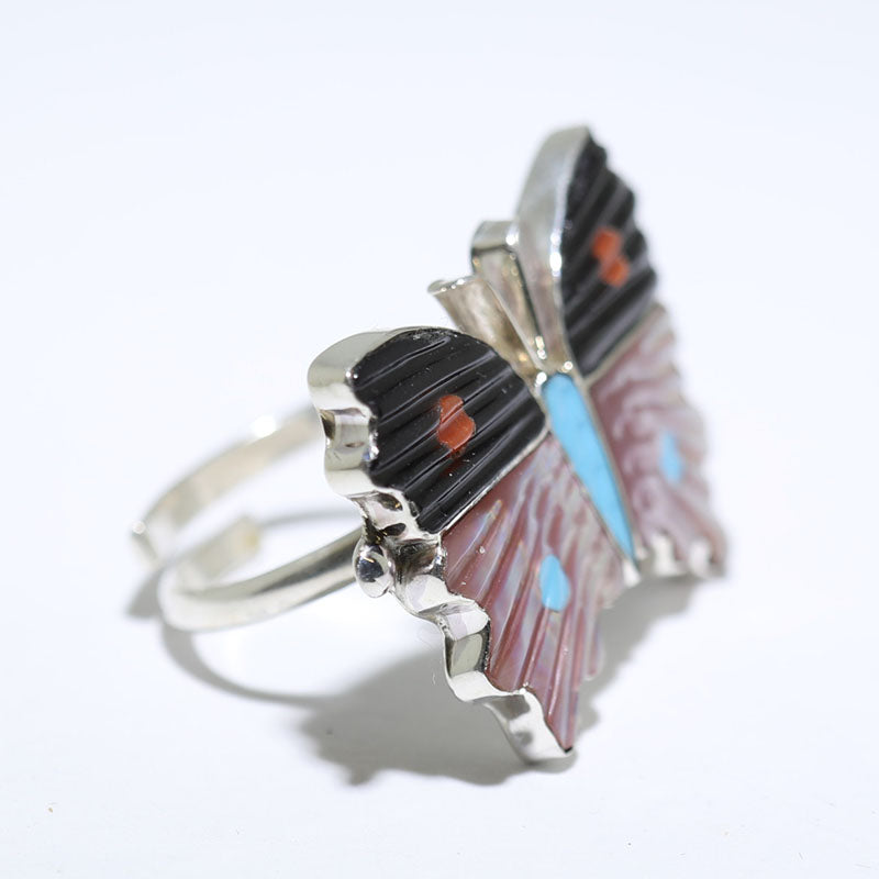 Beautiful sterling silver ring is shaped like a Butterfly and is inlaid with Turquoise, Onyx and Pink Mother of Pearl stones.
