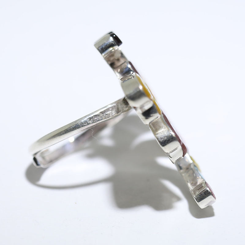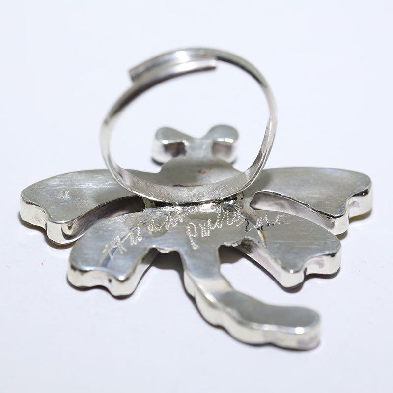 Beautiful sterling silver ring is shaped like a Dragonfly and is inlaid with Turquoise and both Yellow and Pink Mother of Pearl stones.