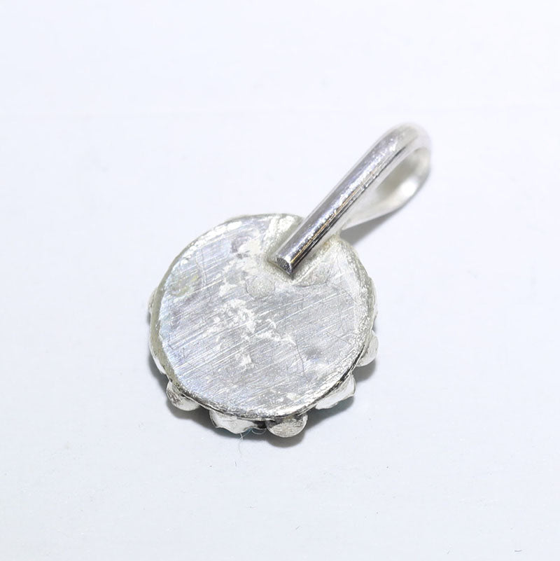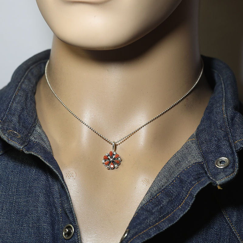 Sterling silver pendant is flower shaped and set with Coral stones.