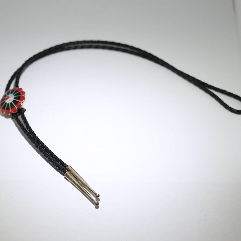Beautiful sterling silver bolo depicts the Sun Face which is inlaid in a colorful style using Fire Opal, Jet, Mother of Pearl and Turquoise stones.