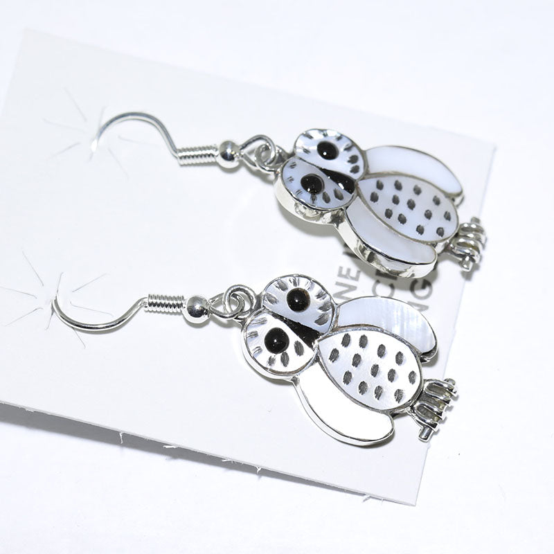 Beautiful earrings are shaped like an Owl and inlaid with White Mother of Pearl and Onyx stones.