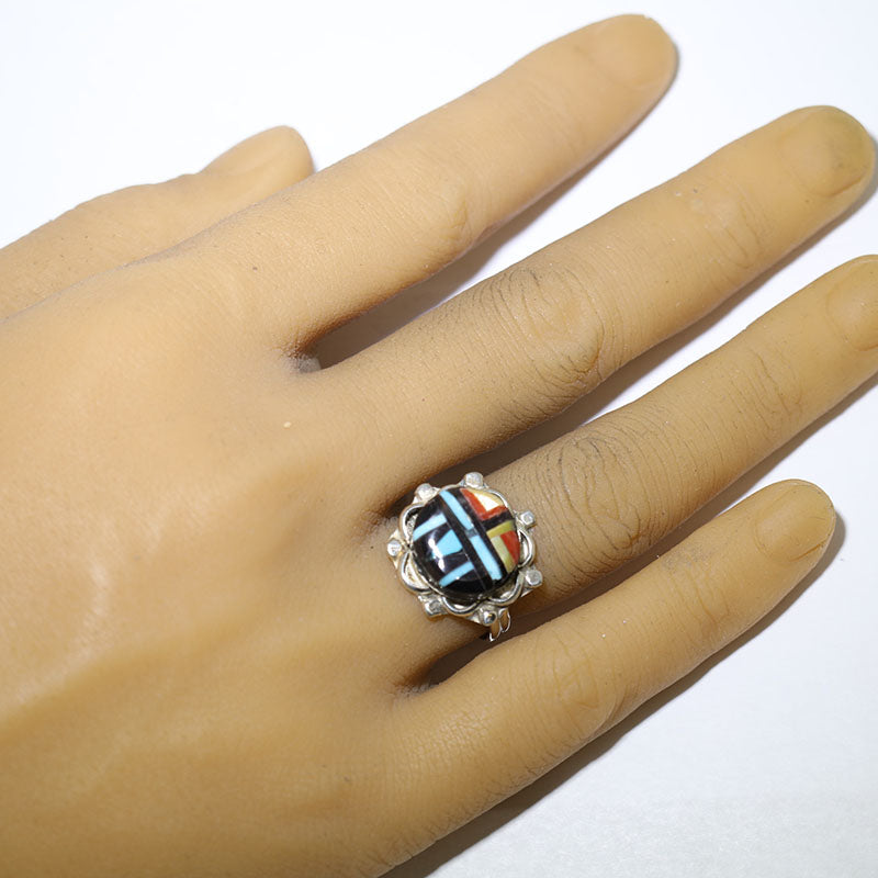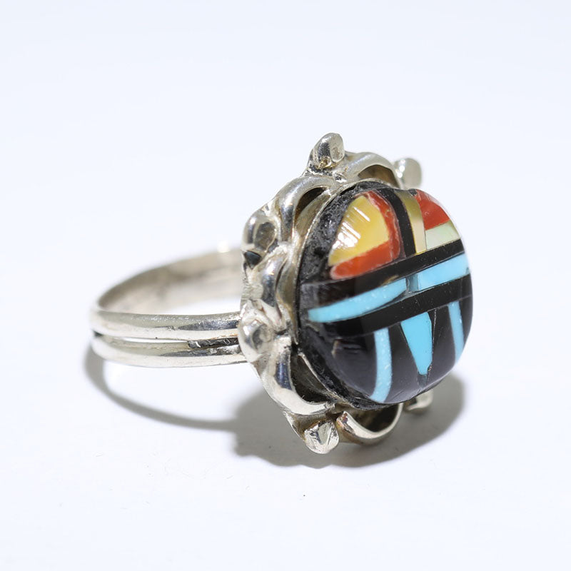 Sterling silver ring is inlaid with a variety of colorful stones which depicts the Sun Face.