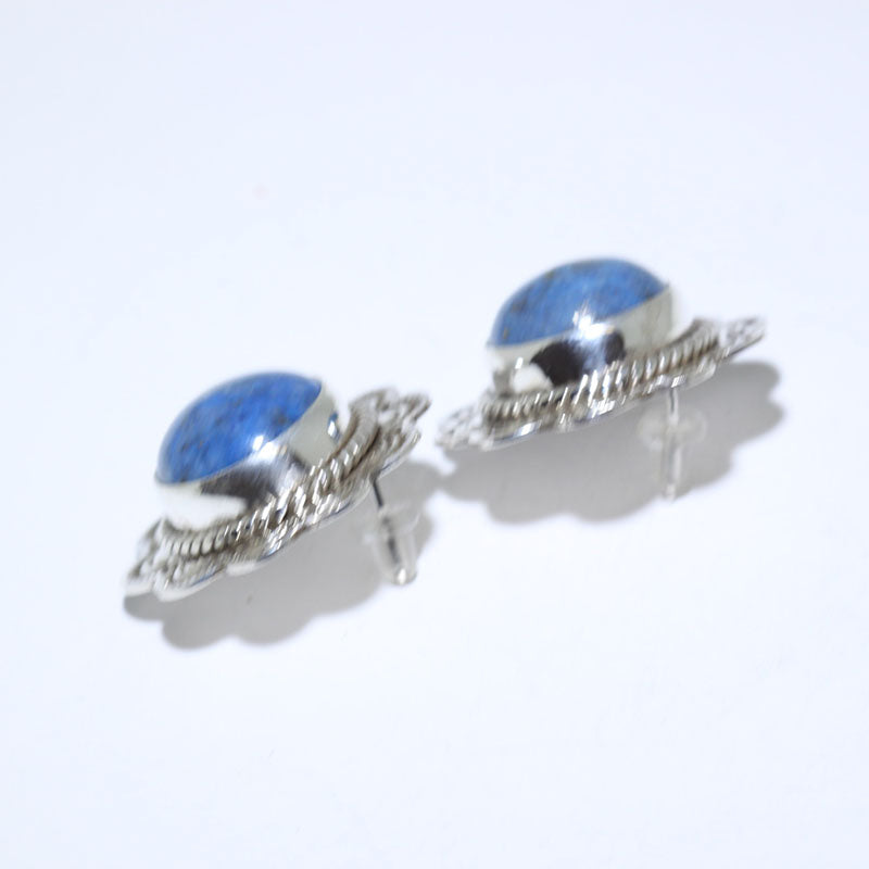 Beautiful denim lapis earrings with a hand stamp design in a post earring.