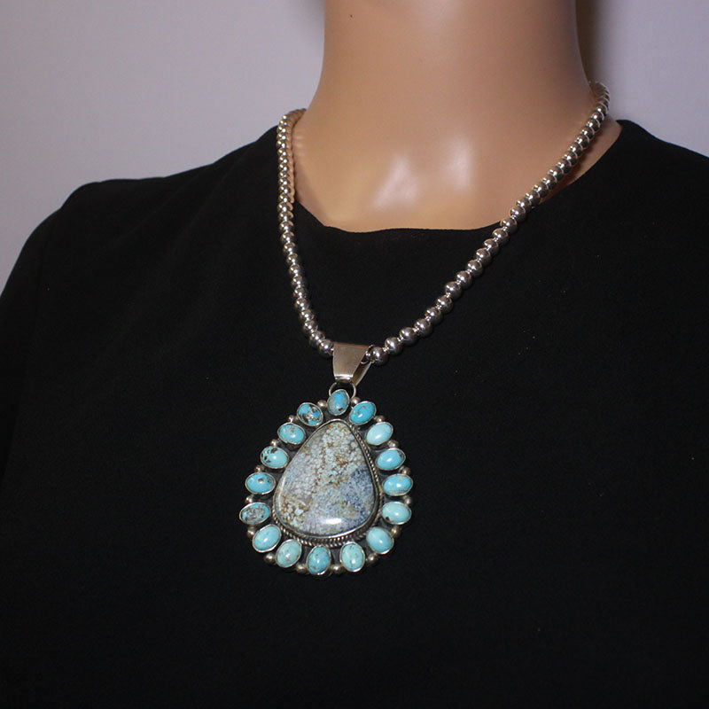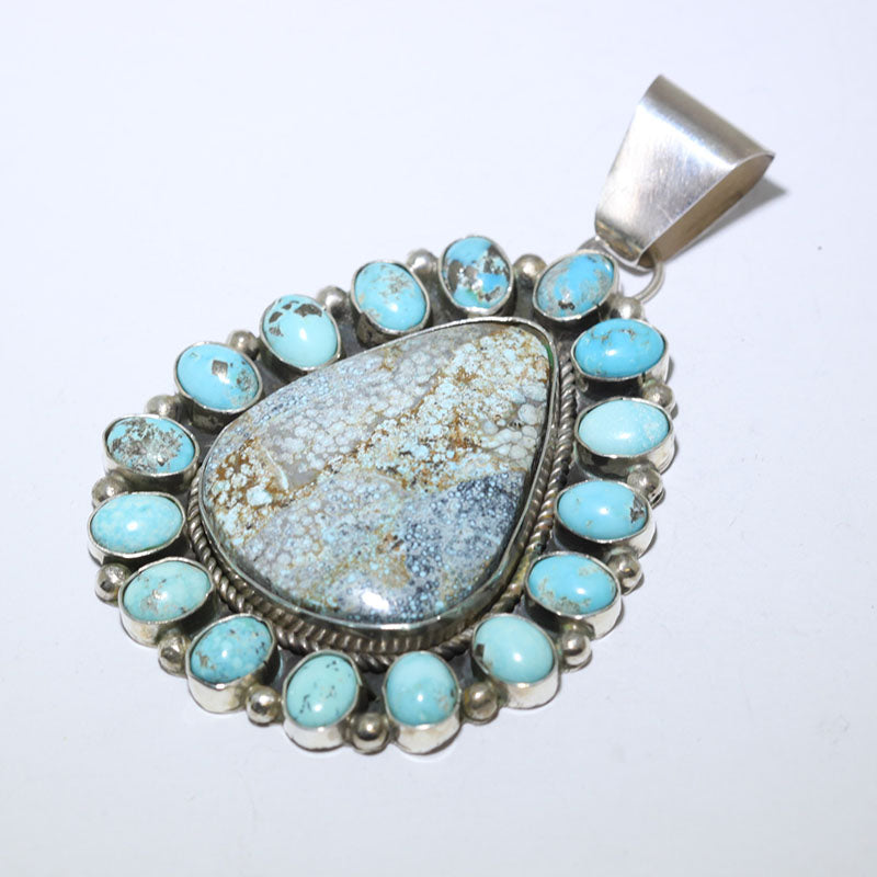 Sterling silver with Number 8 turquoise and Persian turquoise around the center stone, pendant.