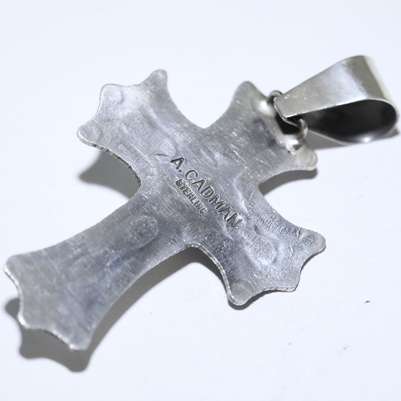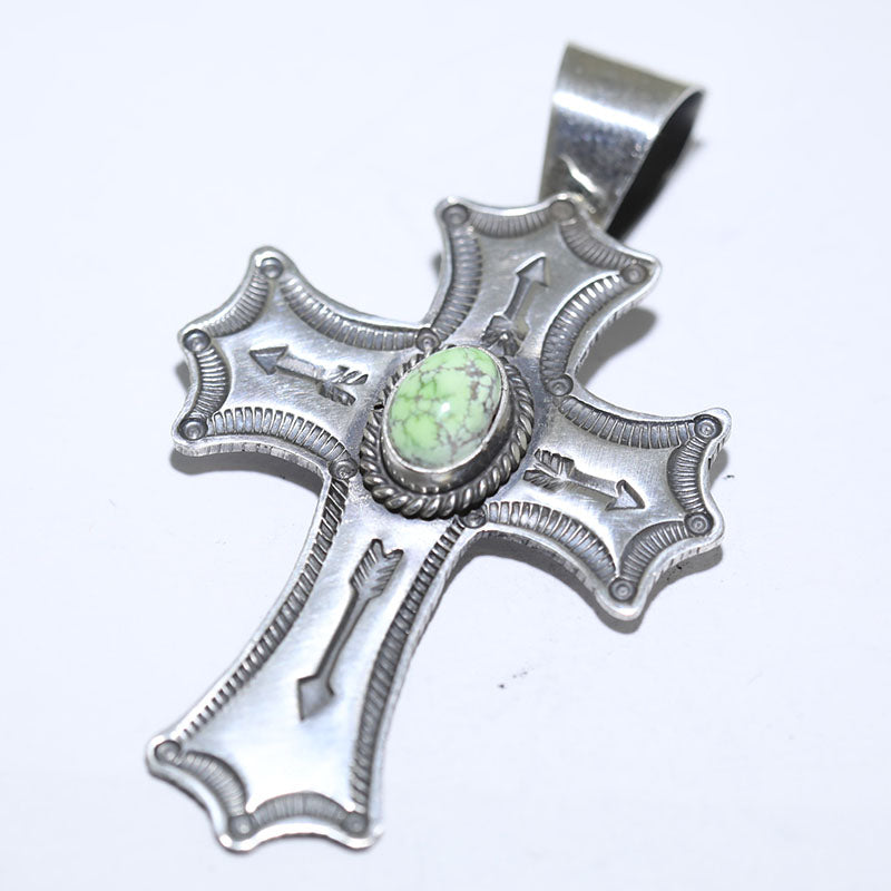 Sterling silver pendant is shaped like a Cross with hand stamped designs and is set with Carico Lake Turquoise.