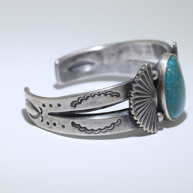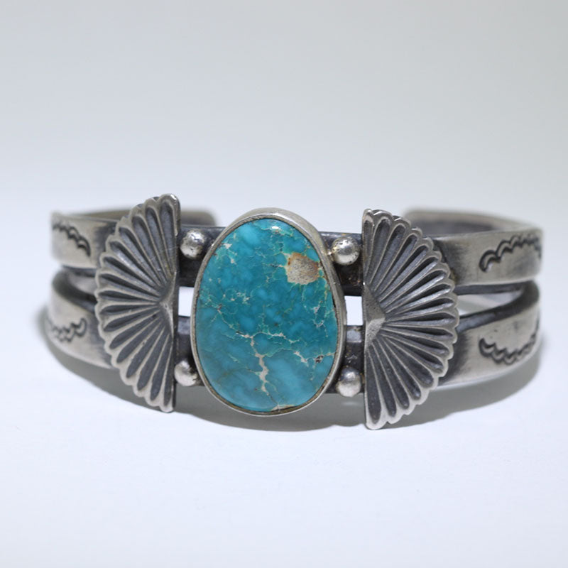 Beautiful bracelet is set with Natural Bright color Fox Turquoise with Fan design. Old techniques are used; all pieces are hammered down to make the shape. It looks like a piece from the 1920's.