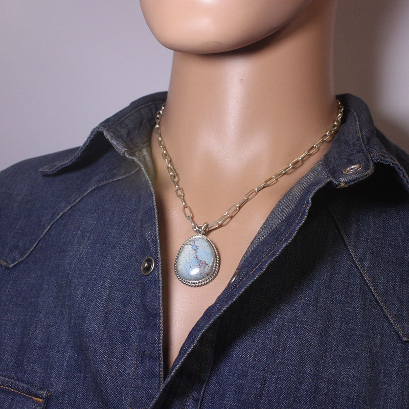 Handmade silver pendant by Navajo Artist, Robin Tsosie. Stone is Natural Golden Hill turquoise from middle east area. It has light sky blue and black matrix with little yellow color. Really popular stones for Native American Artists.