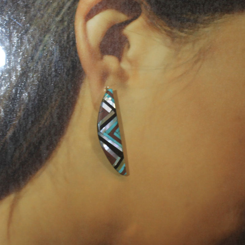 Sterling silver earrings inlaid with mother of pearl, jet, sleeping beauty and jasper.