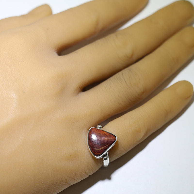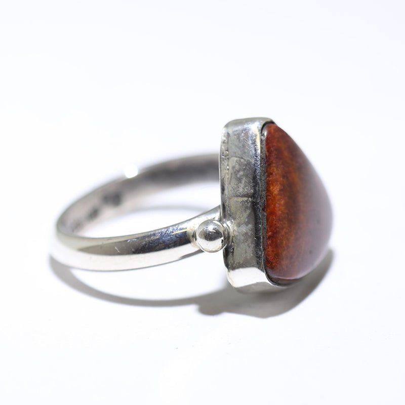 Sterling silver ring is set with Red Spiny Oyster stone and has a silver bead on each side of the stone.
